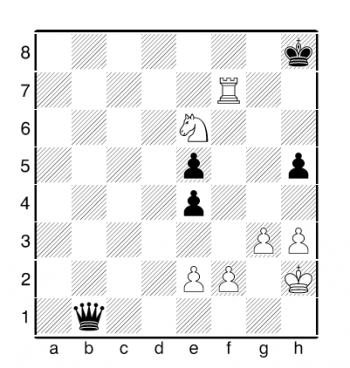 46...La2 47.Rg5 Lxe2 48.Kg1 e3 49.fxe3 Lxe3+ Nüüd peab valge täpselt mängima, et mitte kaotada. Tuleb leida võimalus ohverdada ratsu musta ohtliku vabaetturi e4 eest, mille järel valge vanker seisab f-liinil ning laual on kindlus. 50.Kg2 e4 51.Vf8+ Kg7 52.Vf4 Le2+ 53.Kg1 e3 54.Vf7+? Viigi tegi 54.Re6+ Kg6 55.Rd4 Le1+ 56.Kg2 Ld2+ 57.Kg1 e2 58.Rxe2 Lxe2 59.Vf2.